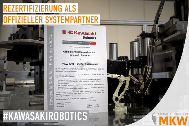 Wir sind sehr stolz, erneut als "offizieller Systempartner von Kawasaki Robotics" zertifiziert worden zu sein. Bereits seit vielen Jahren vertrauen wir auf die präzise Robotertechnik aus dem Hause Kawasaki und freuen uns auch in Zukunft auf eine professionelle Zusammenarbeit und spannende, gemeinsame Projekte.