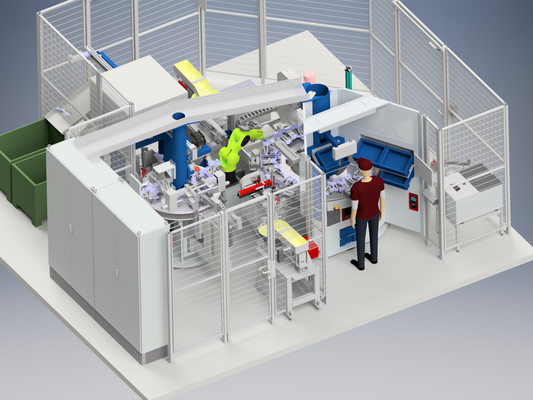 On this machine hinges are assembled, straightened and tested fully automatically. Only the sheet metal parts are inserted manually. The EOLT is here decoupled from the assembly as a second rotary table.