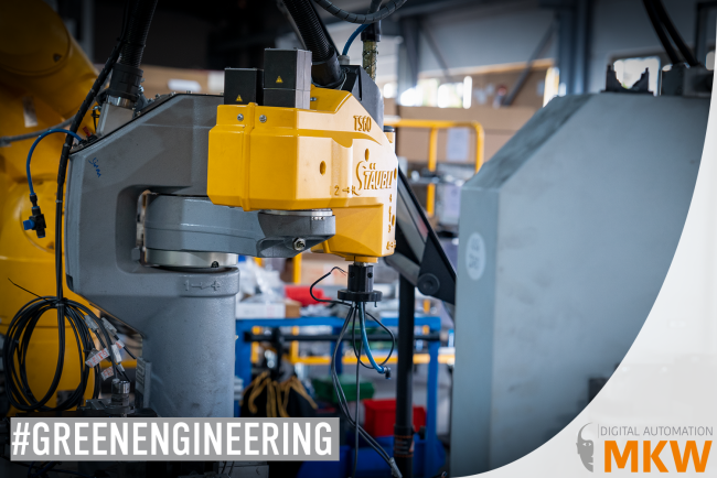 This makes it ideal for our "Green Engineering" project, which is characterized by recycling as many established machine elements as possible. On the pictures you can see the current status of the efficient, new production line, surrounded by well-tried robots, which by no means belong on the scrap heap.